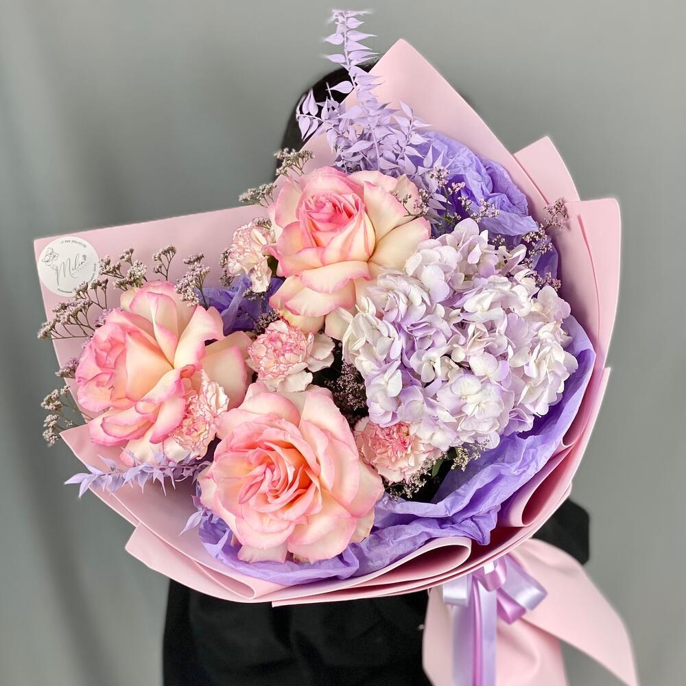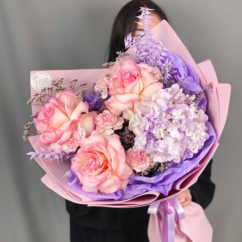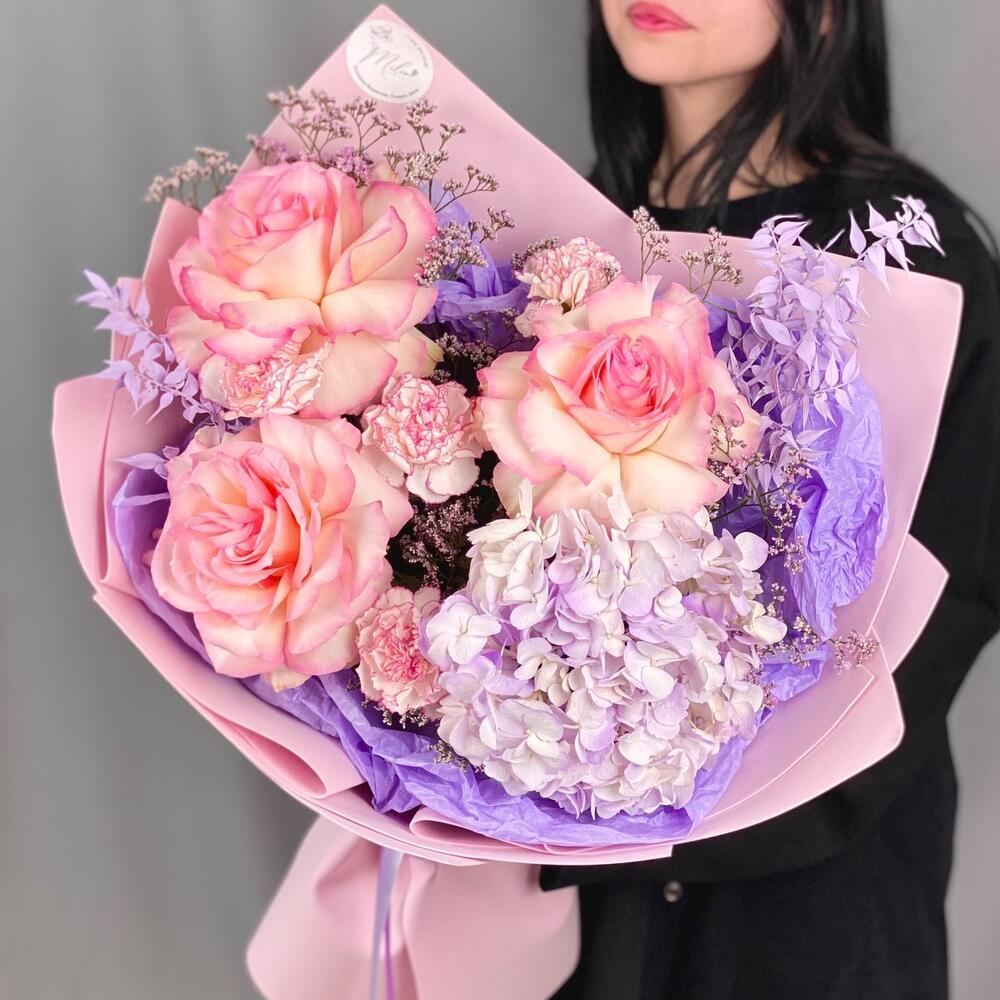 Авторский букет из французских ажурных роз,гортензии,диантусов и сухоцветов.Букет 725